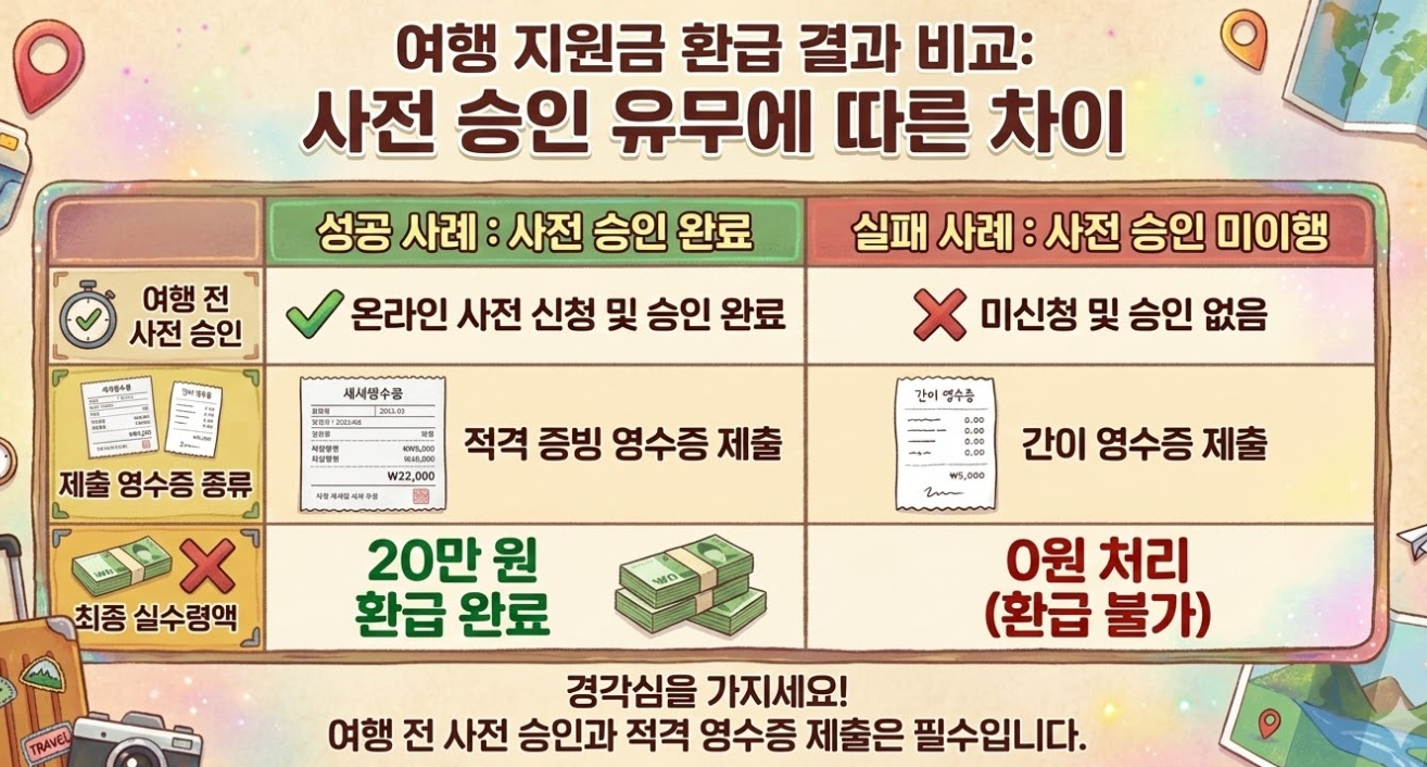 불가능합니다. 본 제도의 가장 핵심적인 규정 중 하나가 바로 여행 전 계획의 사전 승인입니다. 사전에 계획을 제출하여 승인을 받지 않은 상태에서 임의로 지역을 방문해 지출한 내역은, 아무리 정확한 카드 영수증을 첨부하더라도 소급하여 환급 심사 대상에 포함되지 않습니다. 반드시 여행 출발 전에 승인 절차를 완료해야 합니다