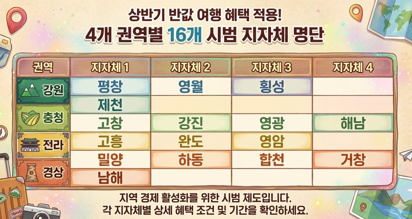 경비 환급 혜택은 전국의 모든 관광지에서 무조건 적용되는 것이 아닙니다. 2026년 상반기에는 정부의 엄격한 심사 기준을 통과하여 최종 선정된 16개의 시범 지자체 방문객에 한해서만 혜택이 주어집니다. 따라서 여행 일정을 수립하기 전, 목적지가 아래의 지정된 권역별 대상 지역에 포함되는지 반드시 교차 검증을 진행해야 합니다.