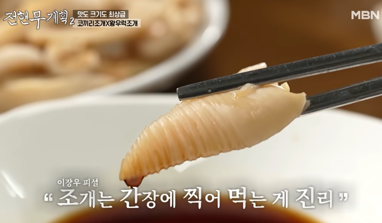 대화에서 드러나는 핵심은 명확하다. 코끼리조개는 쫄깃하고 풍성한 버섯 식감이고, 왕우럭조개는 나물 같은 서걱서걱한 식감이다. 둘 다 처음 먹어보는 독특한 맛이지만, 호불호는 거의 없다. 그리고 중요한 팁 하나, 초장보다는 간장에 찍어 먹는 게 좋다. 간장의 감칠맛이 조개의 단맛을 더 살려준다.