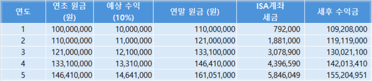 이를 5년동안 수익금으로 계산을 했을 때는 아래와 같이 ISA 계좌를 통해 투자했다고 가정했을때 5년 후 해지시 수익금에 대해 200만원을 비과세로 공제받고 나머지에대해서 9.9% 세금을 제외하면 총 55,204,951원의 세후 수익을 얻게 됩니다.