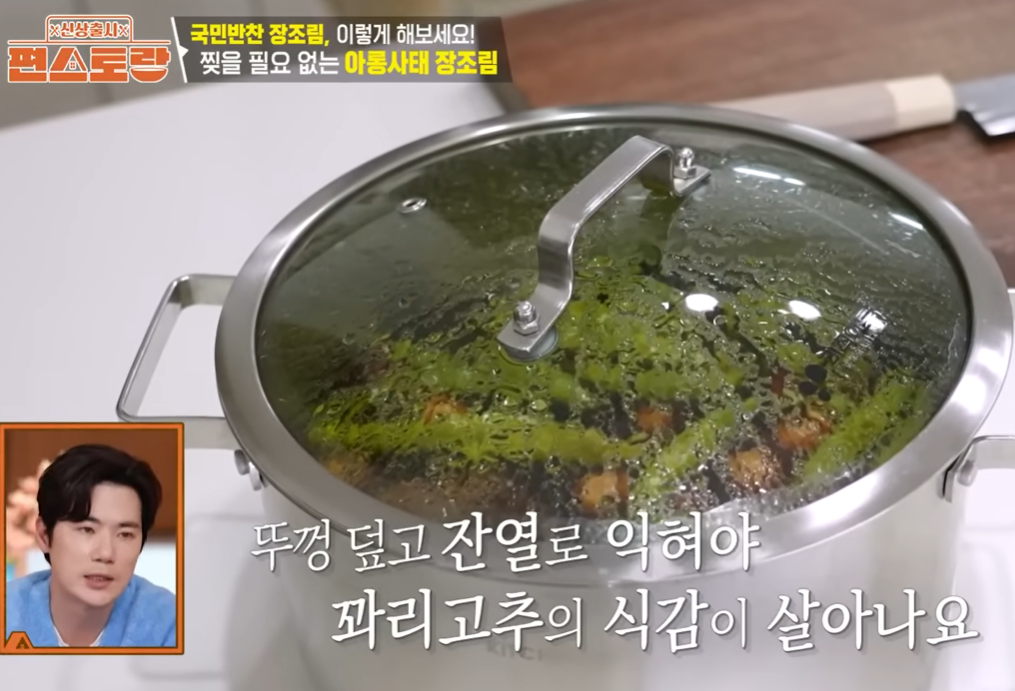 하지만 꽈리고추를 넣고 계속 끓이면 색이 변하고 물러지죠? 김강우 님의 비법은 **불을 끈 상태에서 고추를 넣고 뚜껑을 덮어 10분간 '뜸'**을 들이는 것입니다. 잔열만으로도 고추는 충분히 익고 식감과 색감은 그대로 살아있게 됩니다.