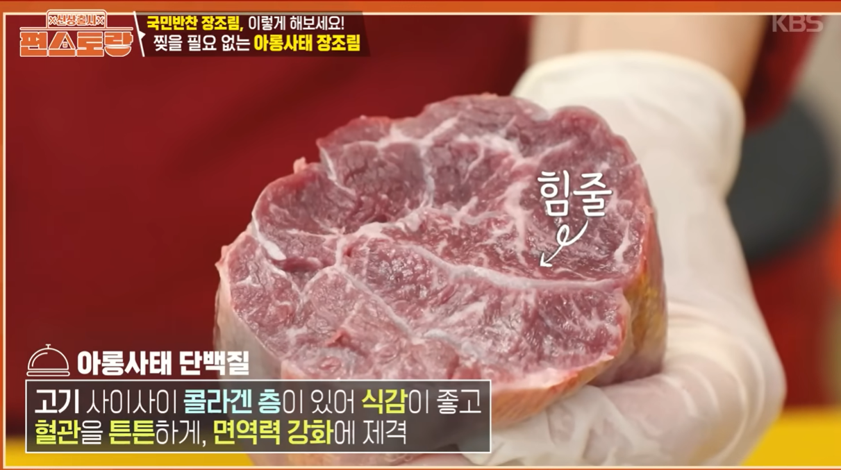장조림은 어떤 고기를 쓰느냐에 따라 식감이 천차만별인데요. 오늘 우리는 김강우 님의 조언대로 '아롱사태'에 주목해야 합니다.